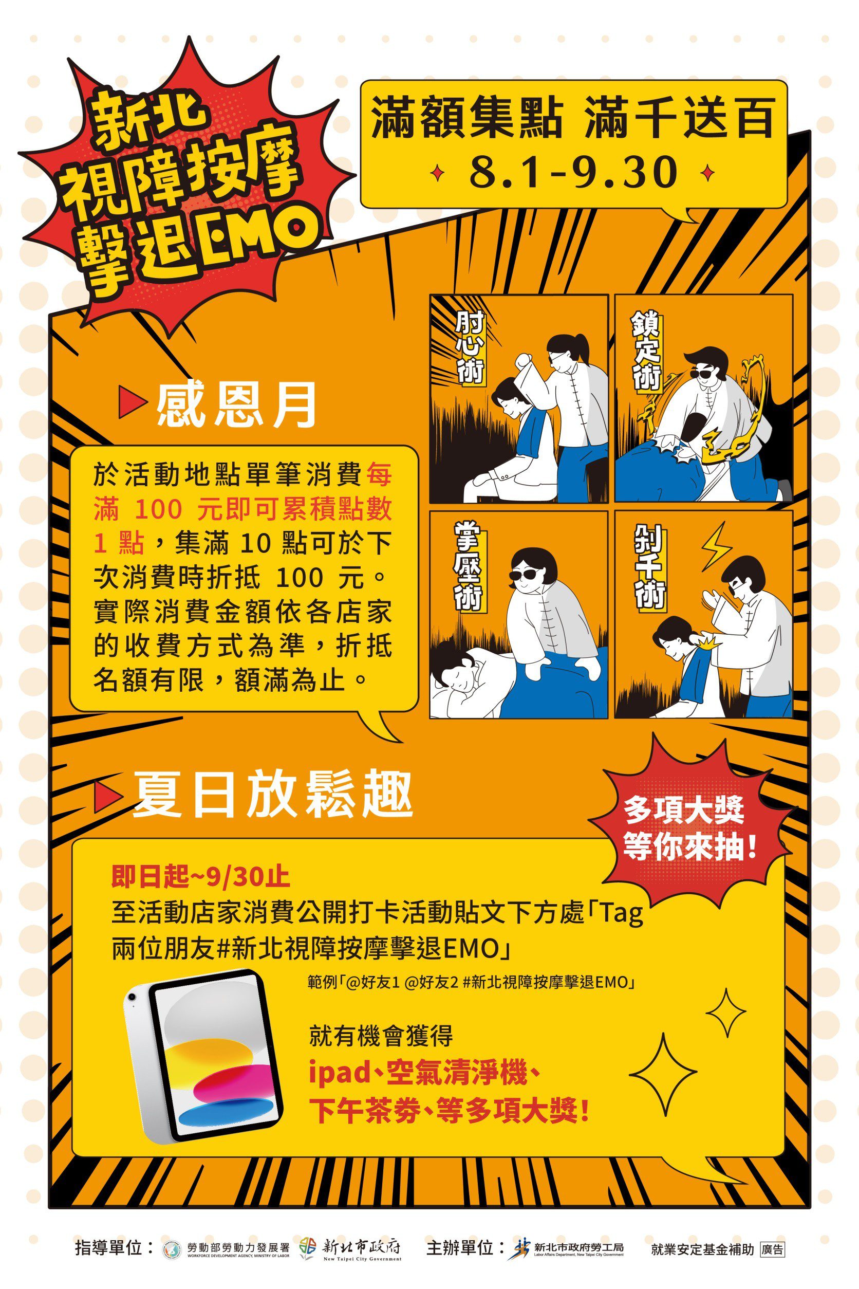 另勞工局輔導設置22家按摩小棧也聯合推出「夏日放鬆趣」活動,即日起至9月底至活動店家消費公開打卡並至新北勞動雲FB 粉絲專頁的「夏日限時驚喜」活動貼文下方處「Tag 兩位朋友#新北視障按摩擊退EMO」,有機會獲得ipad、空氣清淨機及下午茶券等多項大獎。不只如此,還有感恩月活動,消費滿100元即可索取集點卡並獲得1點,集滿10點下次至活動地點消費即可折抵現金100元。大家快把握夏日期間,以實際行動支持視障按摩業,好好按摩放鬆一下,擊退EMO!