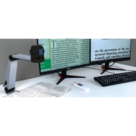 可透過Type-C或USB與電腦、筆電或平板結合使用,也可以使用HDMI介面直接與螢幕連接,非常適合低視力者閱讀書本、報紙和雜誌,外觀像檯燈一樣輕盈、設置簡單快速,透過翻轉鏡頭可直接切換到望遠模式,無需安裝其他軟件即可使用擴視及報讀功能,查看圖像、文字報讀,特別適合學生、上班族攜帶往返家中、學校或工作場所使用。